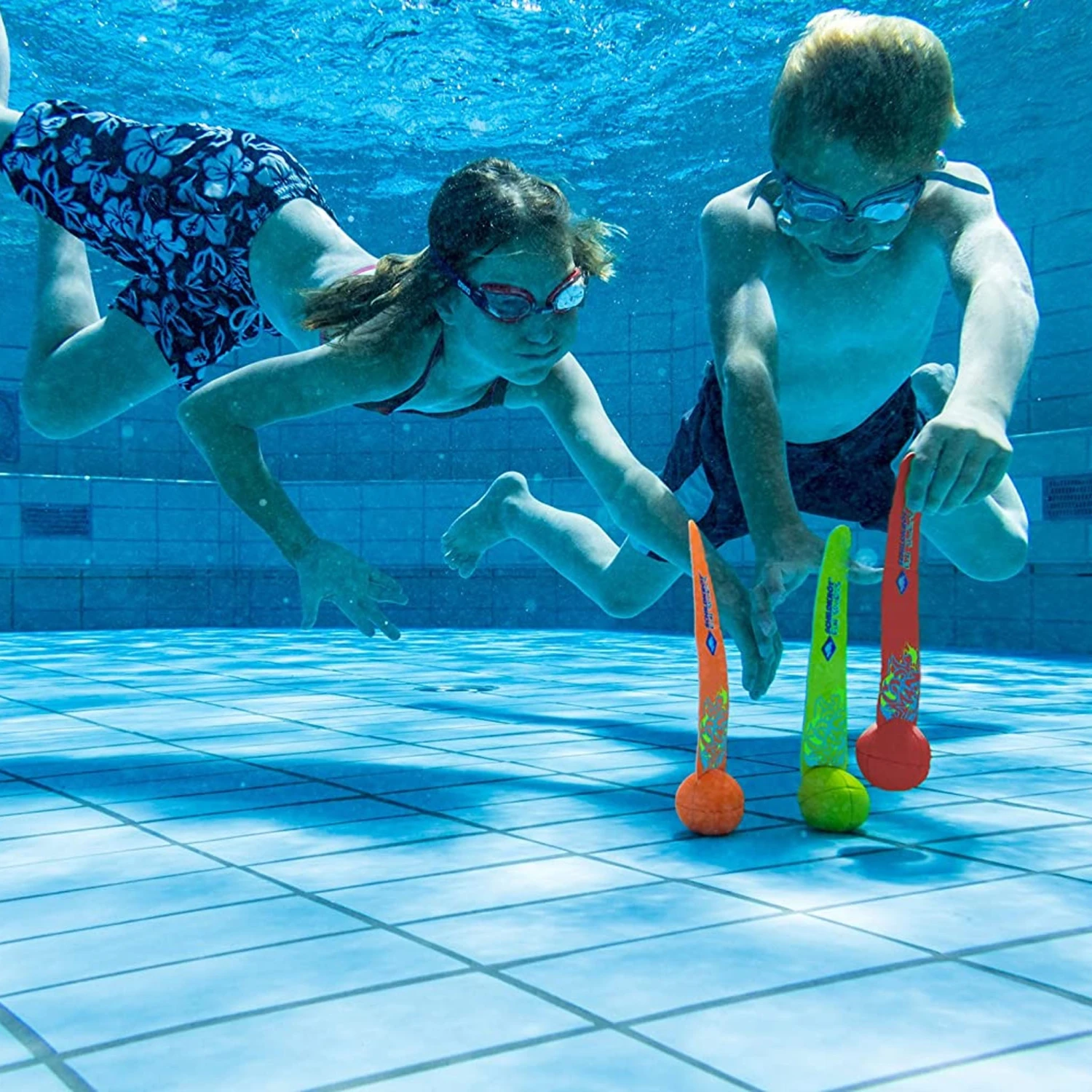 6-piece neoprene diving set consisting of 2 diving rods, 2 diving rings and 2 diving balls with tails. All items have a neoprene cover and sand filling, so they’re soft and grippy. Special features: Ring and rod have a foam insert at one point, making them stand vertically at the bottom of the pool. The tail of the diving ball stands up. Due to these features, even smaller, younger children can grip ring / rod / ball easier in the water and have a faster sense of achievement when diving.