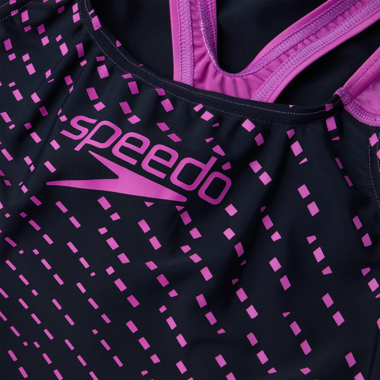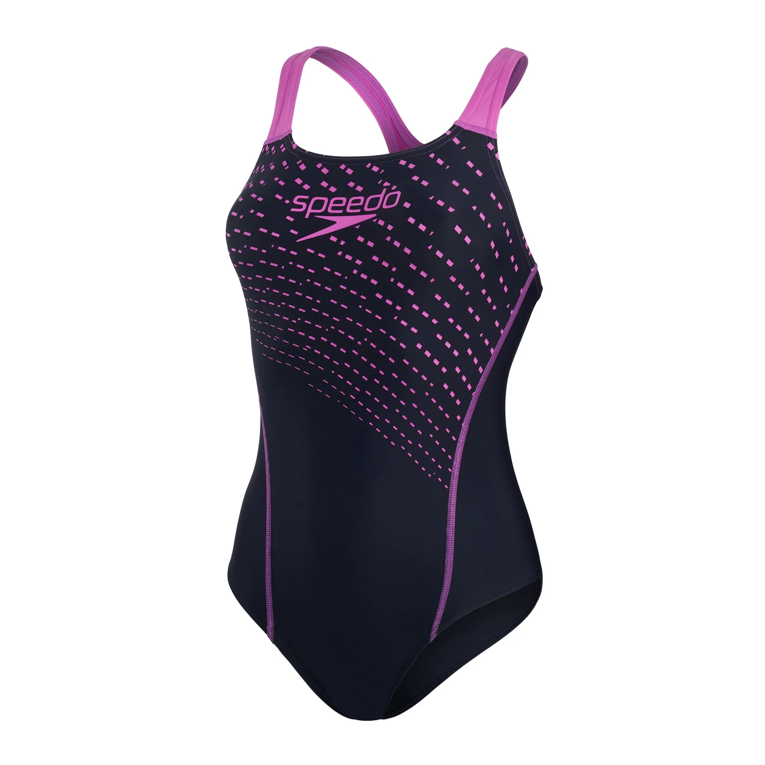 Speedo Essentials – everything you need for a great swim. Cruise through training wearing Speedo’s stylish black Medley Medalist swimsuit, which features an eye-catching kinetic wave plastisol print and pink colour-pop seams and straps. The medalist design is a Speedo classic and aids shoulder movement and flexibility, so you’re comfortable during training. Ideal for regular pool sessions, Speedo’s ECO EnduraFlex fabric offers higher chlorine resistance than standard swimwear fabrics and fits like new for longer with CREORA® HighClo™. Made from 100% recycled waste fabric, so it’s better for the environment too.